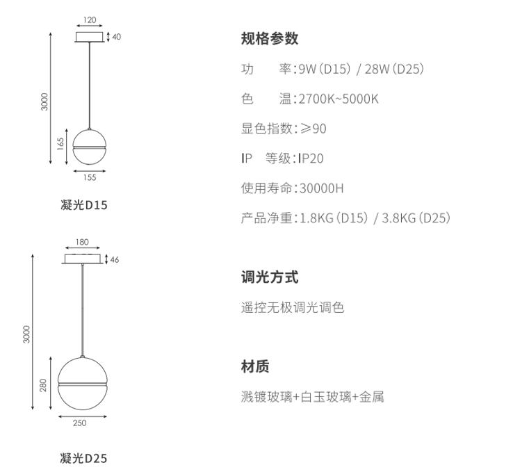 凝光吊灯用双层弯曲的造型作为主要造型特征形成在空间里自由灵动的造型,以一定的角度倾斜,形成丰富的画面,半圆形等分的灯罩采用白玉料与透明溅镀两种工艺,下路利用直下式光学提供充足光线,上路则采用测发光方式,发光面透过溅镀的玻璃曲面折射出一个光的倒影。两种方式组合在一起,使其在简单的几何形态中有自己的表达。