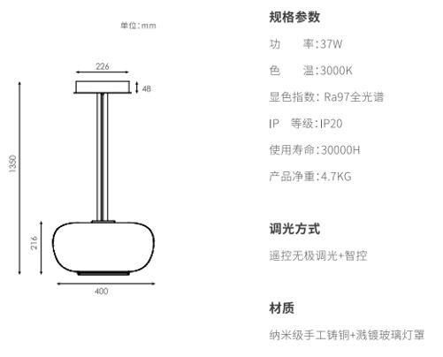 产品简介:手工吹制高硼硅玻璃,圆润柔和;在内部的上路光透过玫瑰金色网格铸铜件投射出类似烛火的效果,在空间里显得更加灵动,外层玻璃采用溅镀金属质感,自下而上渐消,同时镜面镀层折射环境光线,使产品更加轻盈通透不压抑,下路光采用直下光,满足1.5米圆桌面充足照明。同时设计有防眩格栅,桌面边缘的视线高度不会有直接光线照射到,体验舒适。